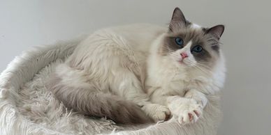 Lilo is a blue mitted Ragdoll, with a bubbly and curious personality. She loves playing with her siblings and cuddling into bed with her family.